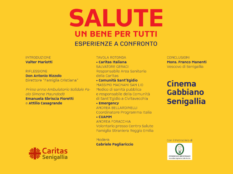 Di questo, oltre che del primo anno di attività del nostro ambulatorio, parleremo sabato 30 marzo al Cinema Gabbiano a partire dalle ore 9.15 nell’ incontro “SALUTE: UN BENE PER TUTTI”, confrontandoci con esperienze simili alla nostra, quali la Comunità di Sant Egidio, Emergency, il Cuamm, l’ area Sanitaria della Caritas nazionale, alla presenza del Direttore di Famiglia Cristiana don Antonio Rizzolo e di Monsignor Franco Manenti Vescovo di Senigallia.