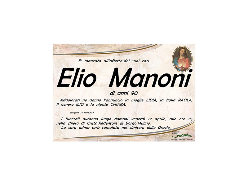 E’ mancato all’affetto dei suoi cari Elio Manoni di anni 90. Addolorati ne danno l’annuncio la moglie Lidia, la figlia Paola, il genero Ilio e la nipote Chiara.