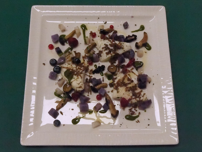 Montare il piatto con i filetti di rombo a costeggiare il bordo del piatto con la punta rivolta verso l’interno, mettere in maniera sparsa aiutandosi con un cucchiaio le patate (eventualmente condire con sale e olio) e i funghi scolati dal liquido di cottura e ripassato a fuoco vivo in padella, aggiungere due/tre bacche di frutti rossi facendole cadere delicatamente sul piatto, grattarci sopra delle lamelle di tartufo nero estivo e poco olio di tartufo e decorare con dell’olio di prezzemolo.