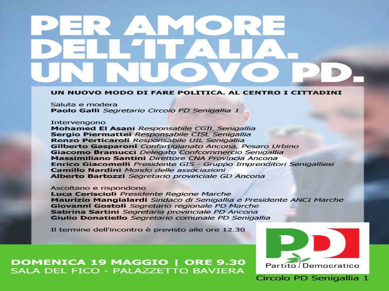 Il Circolo PD Senigallia 1 invita la cittadinanza all’iniziativa “Per amore dell’Italia. Un nuovo PD” che si terrà domenica 19 maggio, dalle ore 9.30 alle ore 12.30, presso la sala conferenze del Palazzetto Baviera.