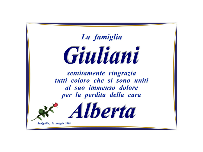 La famiglia Giuliani sentitamente ringrazia tutti coloro che si sono uniti al suo dolore per la perdita della cara Alberta.