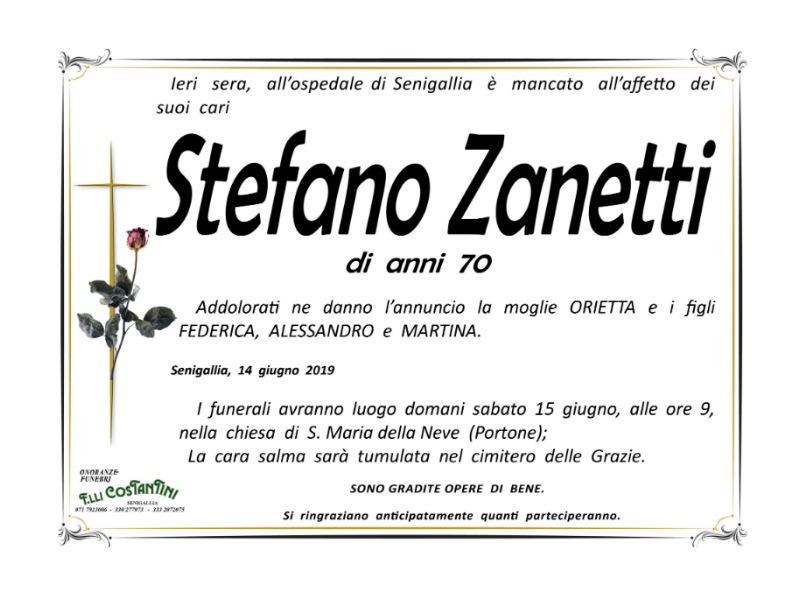 Ieri sera, all’ospedale di Senigallia è mancato all’affetto dei suoi cari Stefano Zanetti di anni 70.