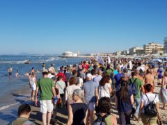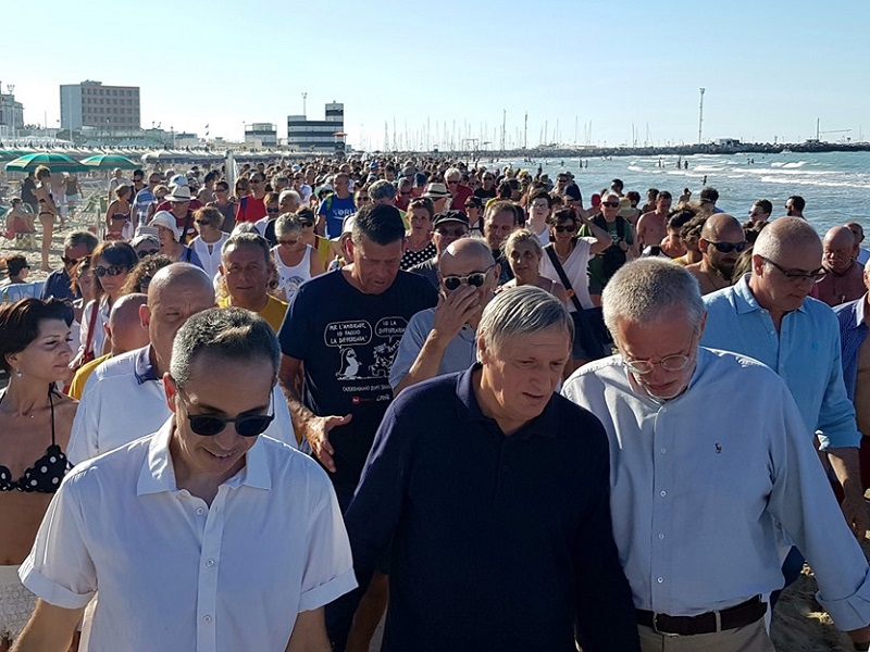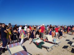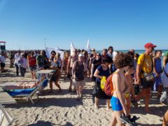 Spiaggia gremita a Senigallia nel pomeriggio di sabato 29 giugno in occasione del Corteo Acquatico per la Legalità, iniziativa facente parte del programma della terza e ultima giornata del CaterRaduno 2019.