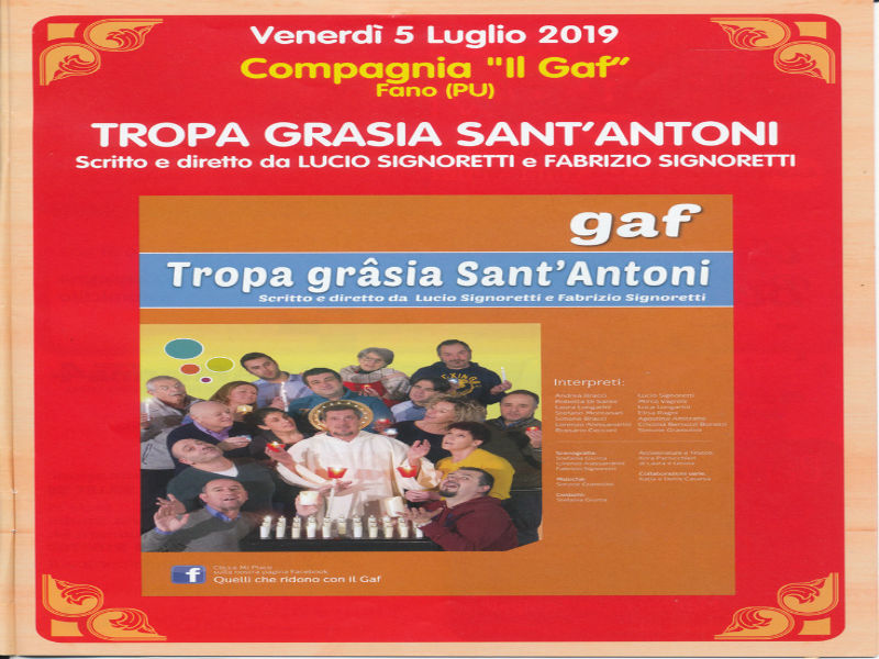 “Tropa grâsia Sant’Antoni” viene presentata dalla Compagnia Teatrale “GAF” di Fano. Lucio e Fabrizio Signoretti, autori e direttori dell’opera, come nelle migliori tradizioni del GAF ci propongono una storia costellata di personaggi surreali, sconclusionati e divertentissimi.