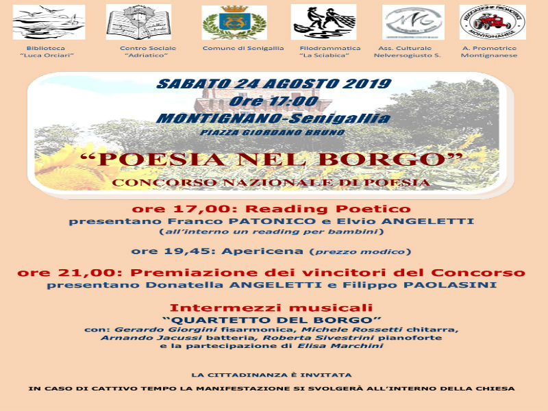 In piazza Giordano Bruno, cuore pulsante del Paese, i poeti, vincitori del concorso di poesia , in vernacolo e in lingua, declameranno le loro opere. Il concorso, giunto alla V edizione, è organizzato dalla Biblioteca Comunale “L.Orciari” di Marzocca, in collaborazione con il Centro Sociale “Adriatico”, la “Promotrice Montignanese” e la Filodrammatica “La Sciabica” con il patrocinio del Comune di Senigallia. Intervalli musicali eseguiti dal “Quartetto del Borgo” con Gerardo Giorgini fisarmonica ed armonica, Michele Rossetti chitarra, Armando Iacussi batteria e il maestro Roberta Silvestrini, pianoforte; voce solista Elisa Marchini.