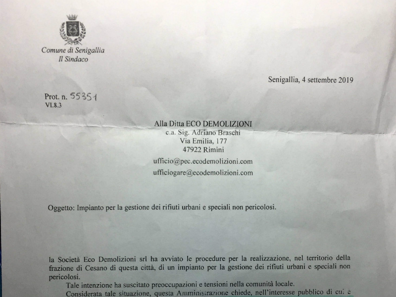 Impianto rifiuti a Cesano, la lettera inviata dal Sindaco alla Eco Demolizioni