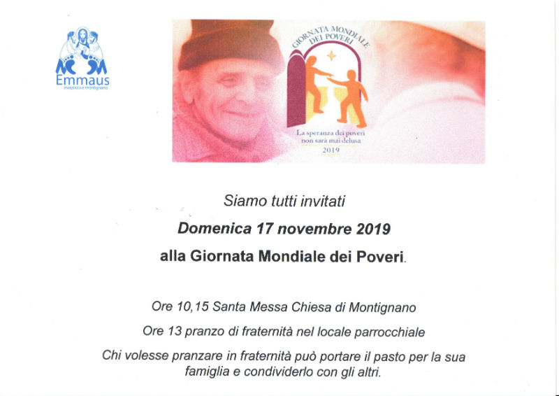 Domenica 17 novembre, giornata Mondiale dei Poveri, indetta da Papa Francesco per la prima nel 2017, il gruppo Caritas di Montignano organizza una giornata speciale con il seguente svolgimento: