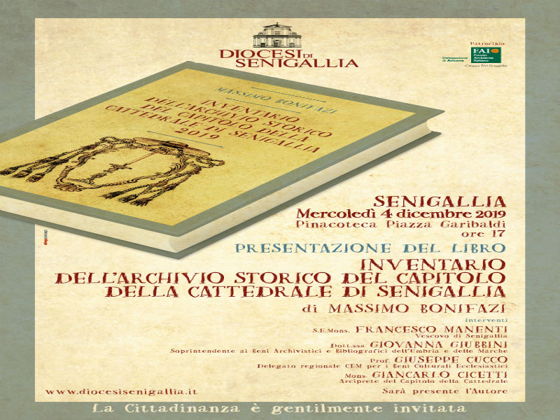 Sarà presentato mercoledì 4 dicembre a Senigallia, alla Pinacoteca Diocesana nella piazza Garibaldi, alle ore 17 il libro dal titolo “Inventario dell’Archivio Storico del Capitolo della Cattedrale di Senigallia”.