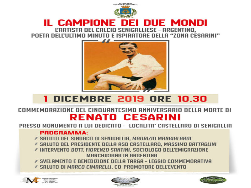 Domenica 1° dicembre 2019, ore 10:30, con una significativa cerimonia, a 50 anni dalla morte, verrà ricordato il grande campione di calcio Renato Cesarini.