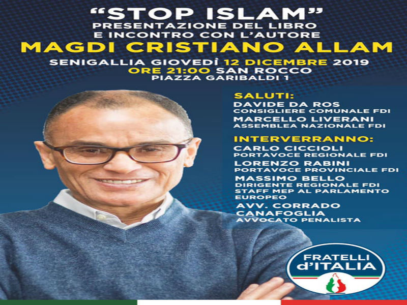 Magdi Cristiano Allam ritorna a Senigallia, invitato da Fratelli d’Italia, per presentare il suo nuovo libro “Stop Islam”.