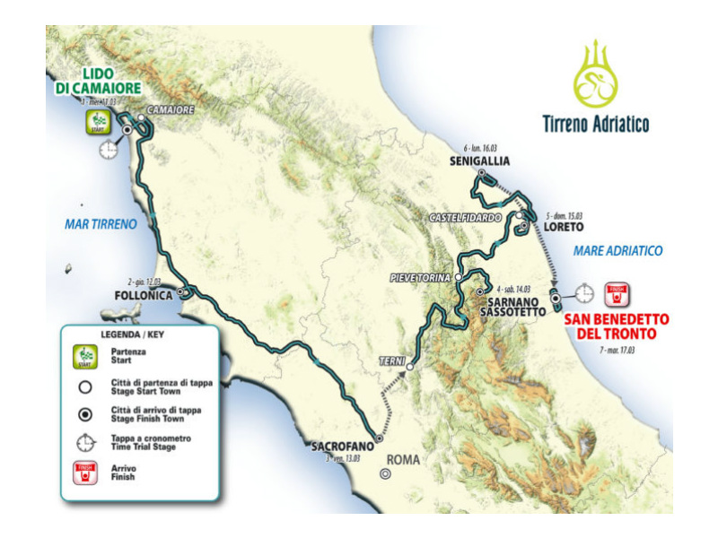 Come illustrato nel dettaglio dalla gazzetta.it. si tratta di sette le tappe, senza giorni di riposo: Camaiore resta la città di partenza anche se non ci sarà la crono squadre ma una tappa in linea, adatta ai velocisti (134 km). La seconda frazione va da Camaiore a Follonica, con circuito finale di 20 km e il breve strappo dell’Impostino (198 km). La terza giornata, da Follonica a Sacrofano, offre una tappa lunga e ondulata con finale al 6-7% di pendenza (233 km). Giornata chiave sabato 14 marzo con l’arrivo in quota (1.362 metri) a Sarnano-Sassotetto, dopo la partenza da Terni e 204 km (con 4 Gpm complessivi). La quinta tappa, Pieve Torina-Loreto (181 km), è quella dei Muri. Sono tutti concentrati nei 3 giri di circuito che portano la corsa a affrontare 3 volte la salita di Loreto (che costituisce l’arrivo) e 3 volte quello di Recanati. Anche questa è una giornata molto dura. Sesta frazione da Castelfidardo a Senigallia (179 km), non particolarmente impegnativa, e conclusione a San Benedetto del Tronto con la tradizionale cronometro individuale di 10,050 km.