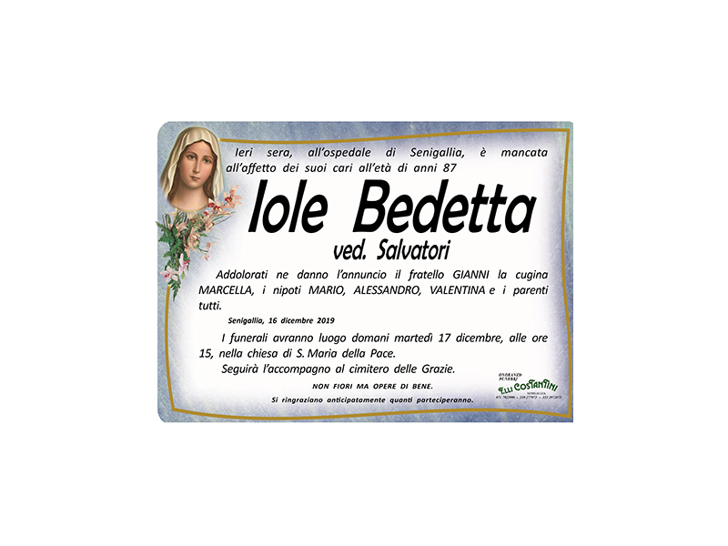 Ieri sera, all’ospedale di Senigallia, è mancata all’affetto dei suoi cari all’età di anni 87 Iole Bedetta ved. Salvatori.