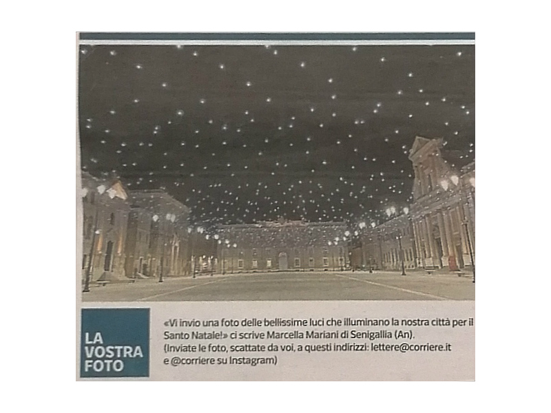 Il grande successo delle luci natalizie di Senigallia è ormai un caso nazionale, tanto che perfino il Corriere della Sera ha scelto di pubblicare uno splendido scatto di piazza Garibaldi inviato dalla signora Marcella Mariani. La foto, che ritrae il suggestivo cielo stellato che sta incantando cittadini, visitatori e turisti, è apparso sull’edizione di mercoledì 18 dicembre.