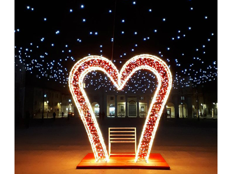 A Senigallia è iniziata la settimana dedicata all’amore ed alla Festa degli innamorati: San Valentino. Dal tardo pomeriggio del 10 febbraio il centro storico si è illuminato di rosso: un gigantesco cuore rosso, con tanto di panchina dove tutti gli innamorati possono immortalare i loro baci, capeggia sulla splendida cornice di Piazza Garibaldi e del suo oramai noto cielo stellato.