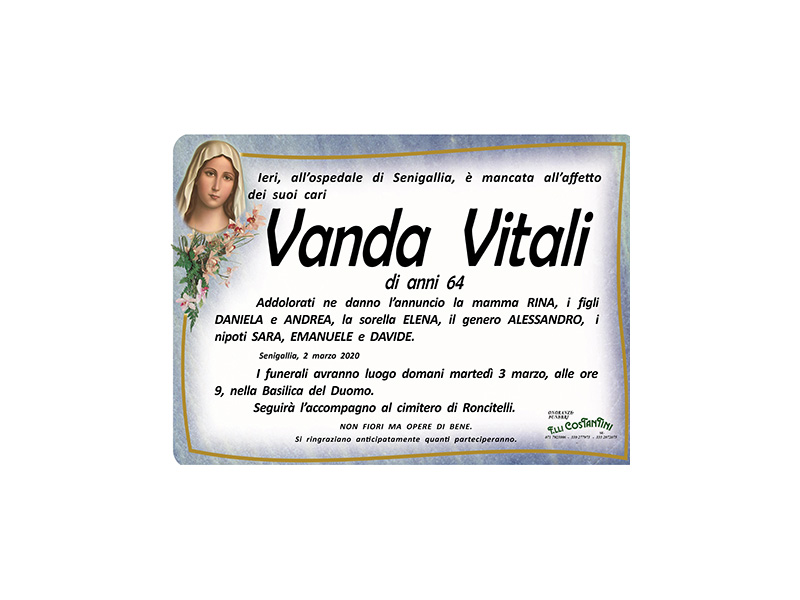 Ieri all’ospedale di Senigallia, è mancata all’affetto dei suoi cari Vanda Vitali, di anni 64.