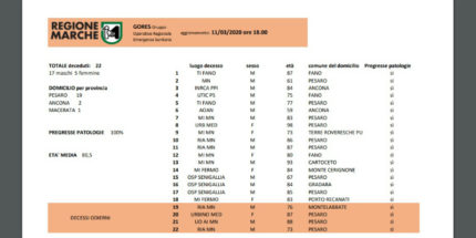Nell’ultimo bollettino della Regione sono stati anche specificati altri dati relativi ai 22 decessi: nello specifico si tratta di 17 maschi e 5 femmine. Di questi 19 erano domiciliati a Pesaro, 2 ad Ancona ed 1 a Macerata.