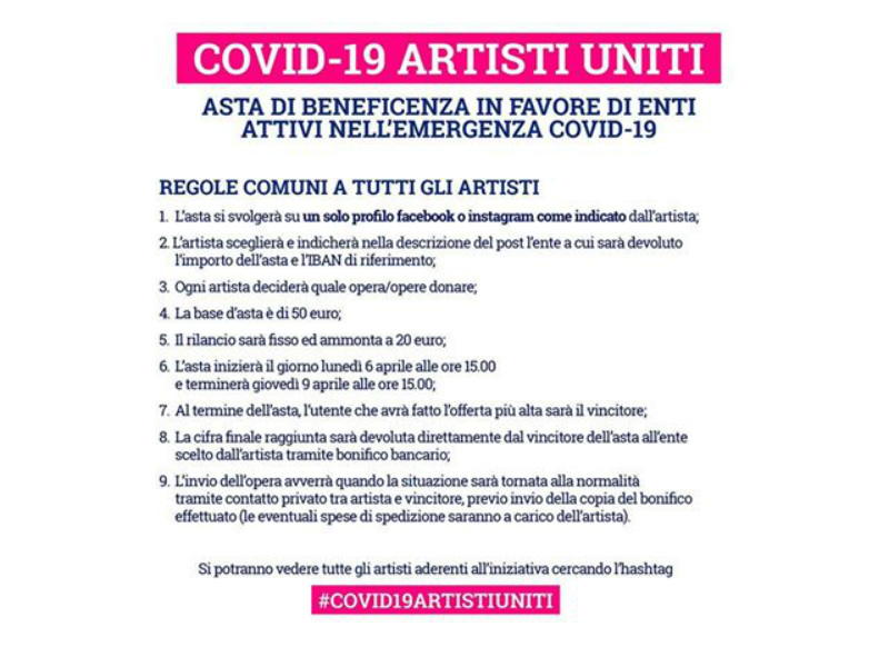 ricavato andrà devoluto all’ente scelto dall’artista stesso. Per partecipare basta collegarsi al gruppo facebook Covid-19 Artisti Uniti in un’asta di Beneficenza, sfogliare le opere e seguire le indicazioni.