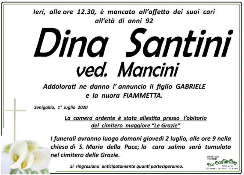 Ieri, alle ore 12.30, è mancata all’affetto dei suoi cari all’età di anni 92, Dina Santini, vedova Mancini.