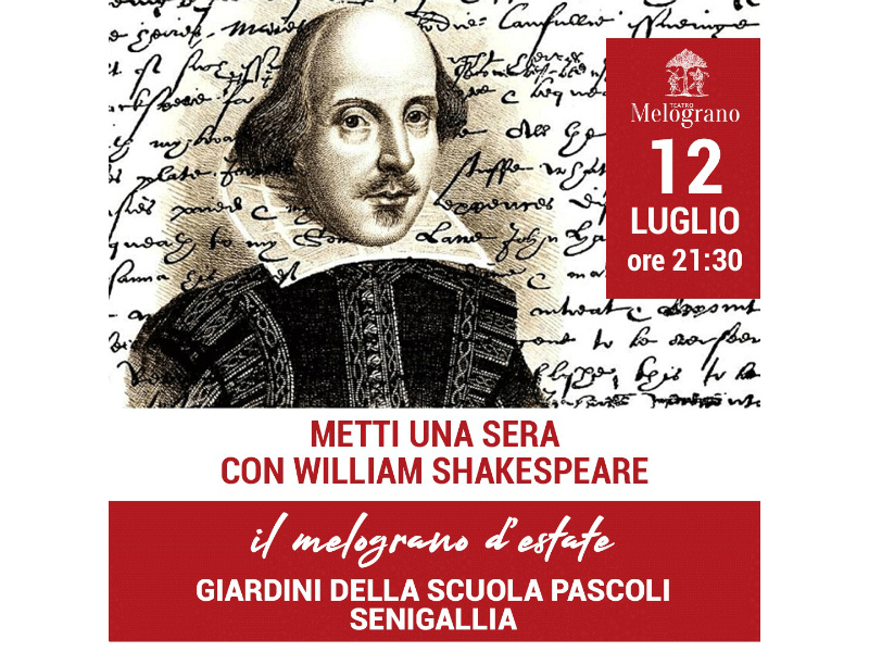 Il 12 luglio la compagnia vi da appuntamento ai giardini della scuola Pascoli con il rea-ding letterario che ha come protagonista il Maestro William Shakespeare. Gli aneddoti della vita del più grande drammaturgo di tutti i tempi sono intervallati dai suoi sonetti rag-gruppati per tematiche. Il tempo divoratore, la zittita musa, il sonno negato, la morte con il suo mesto rintocco e l’amore come faro fisso che sovrasta la tempesta e non vacilla mai, quasi assumono le sembianze di personaggi che trasporteranno lo spettatore nella più intima coscienza di William Shakespeare. Il tutto accompagnato dalla musica dal vivo del-la cantante e musicista Pamela Lucciarini di Pesaro.