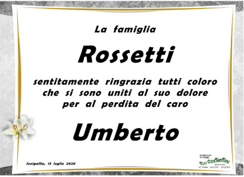 La famiglia Rossetti sentitamente ringrazia tutti coloro che si sono uniti al suo dolore per la perdita del caro Umberto.