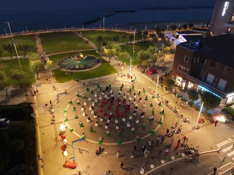 Inaugurata l’«arena tricolore» in piazzale della Libertà, allestita con 105 pouf bianchi, rossi e verdi, nel segno della sicurezza. Spiega Matteo Ricci: