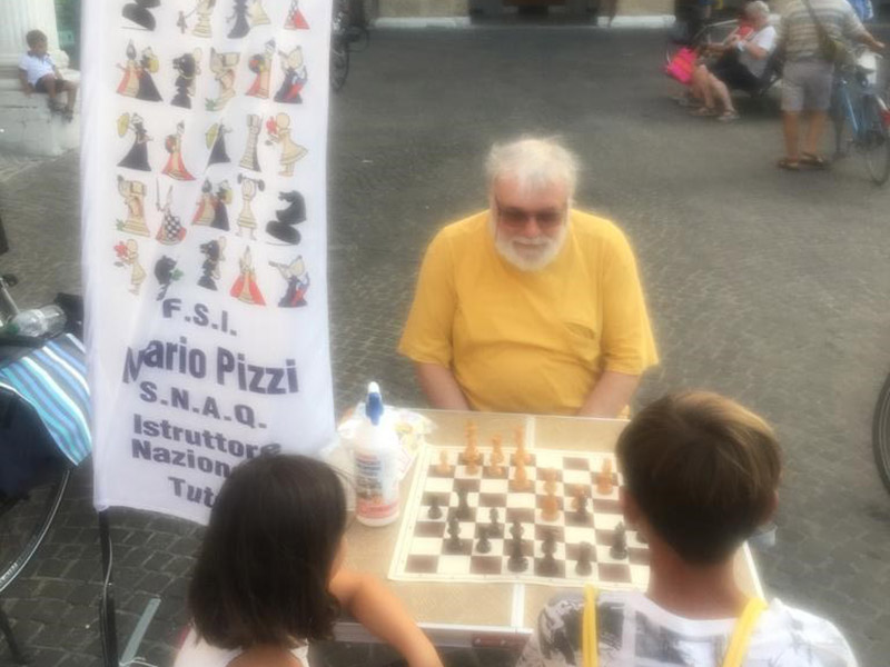 Gli scacchi di Mario Pizzi hanno già “vagabondato” presso il campo estivo Sena Park, bagni 25, Associazione Bellanca, piazza Saffi, piazza del Duca e piazza Roma.