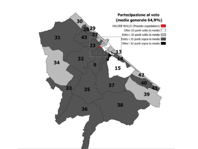 Nella categoria del grigio chiaro ricadono tutte le sezioni in cui la partecipazione al voto è stata entro i 10 punti sotto la media. E sono, oltre le sezioni di Roncitelli (n. 34) e Montignano (n. 39), tutte quelle che si trovano sulla costa dal Cesano a Marzocca, eccezion fatta per la già citata sezione n. 1 del Centro storico.