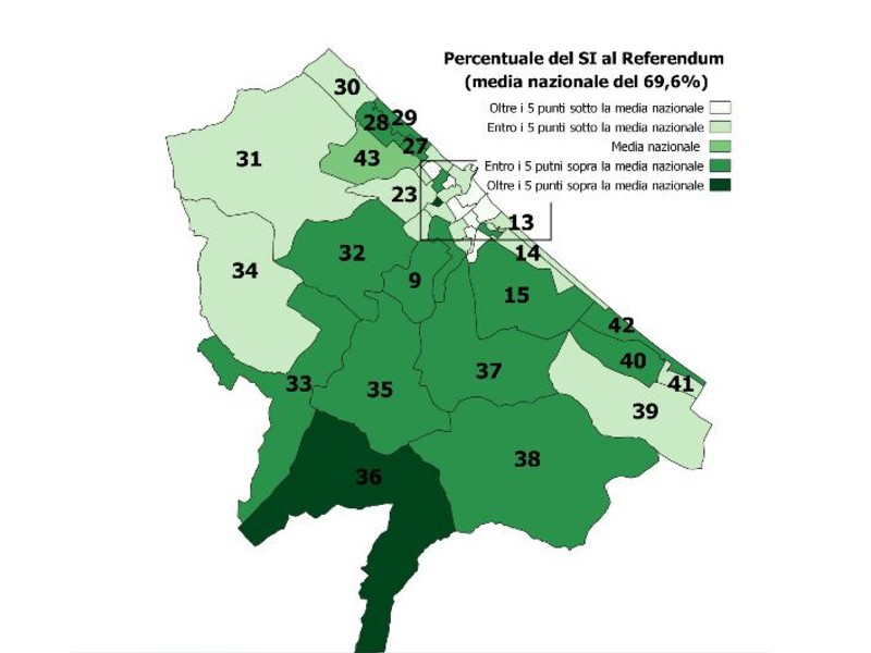 Prendendo come riferimento il dato dell’esito nazionale è interessante vedere che, escluse le sezioni n. 19, zona Parco della Pace e n. 11, zona Saline lato monte, si concentrano tutte nel centro urbano della città e nelle sezioni ad esso contigue le percentuali più basse raggiunte dal Sì.