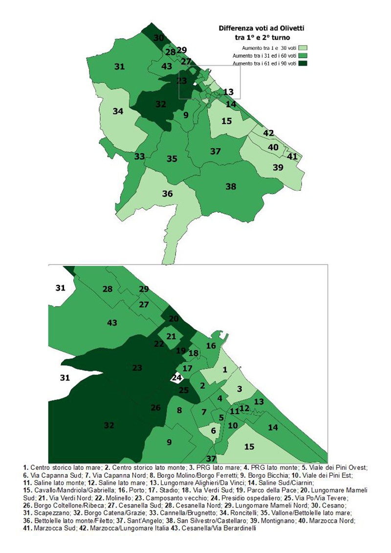 Voti a Massimo Olivetti: confronto tra primo e secondo turno - mappa completa