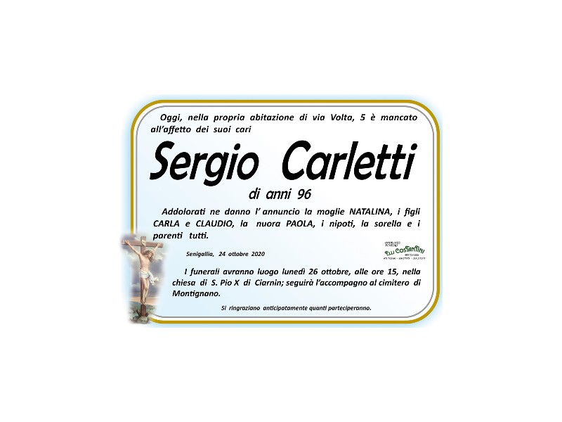 Oggi, nella propria abitazione di via Volta, 5 è mancato all’affetto dei suoi cari Sergio Carletti di anni 96.