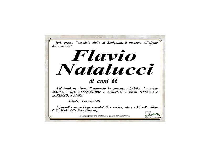 Ieri, presso l’ospedale di Senigallia, è mancato all’affetto dei suoi cari Flavio Natalucci di anni 66.