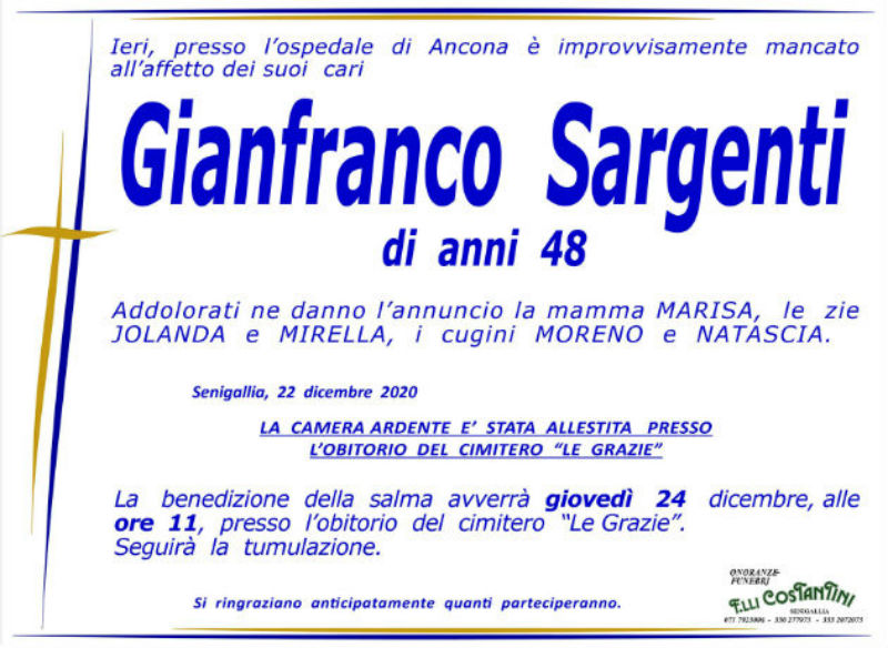 Ieri, presso l’ospedale di Ancona è improvvisamente mancato all’affetto dei suoi cari Gianfranco Sargenti, di anni 48.