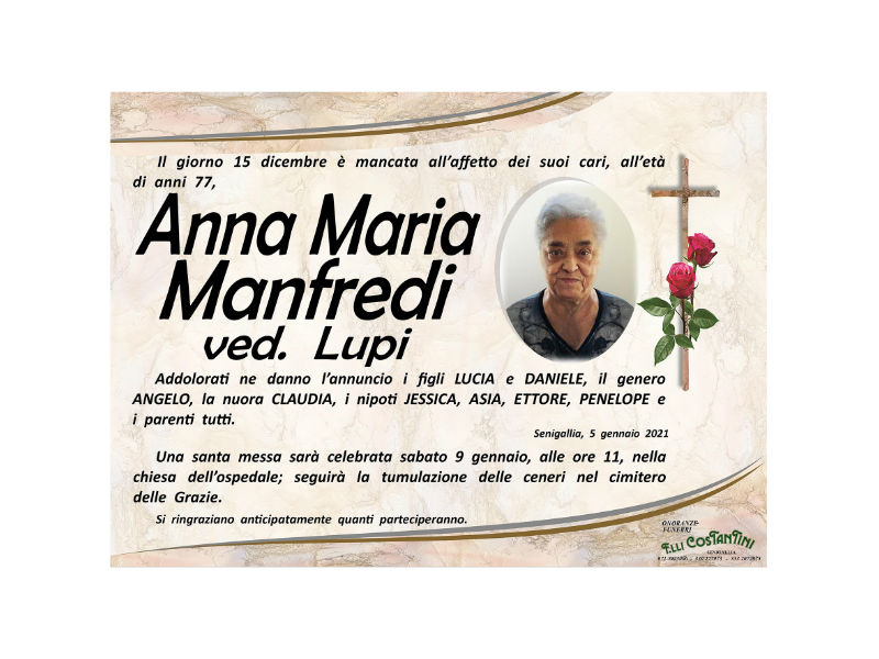 Il giorno 15 dicembre è mancata all’affetto dei suoi cari, all’età di anni 77, Anna Maria Manfredini ved. Lupi. Addolorati ne danno l’annuncio i figli Lucia e Daniele, il genero Angelo, la nuora Claudia, i nipoti Jessica. Asia, Ettore, Penelope e i parenti tutti.