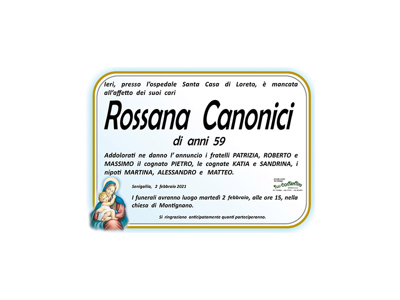 Ieri, presso l’ospedale Santa Casa di Loreto, è mancata all’affetto dei suoi cari Rossana Canonici di anni 59.