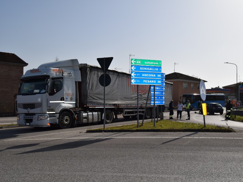 Per cause in corso di accertamento da parte della Polizia Locale di Senigallia si è verificato uno scontro laterale fra una Lancia Y che procedeva con direzione mare-monte condotta da una donna, G.P., di 53 anni, residente in un Comune dell’hinterland ed il semirimorchio di un autoarticolato che procedeva in direzione opposta, condotto da R.A., quarantaseienne residente nella provincia di Ancona.