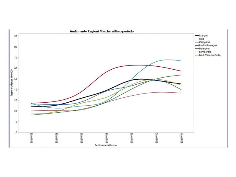 La scorsa settimana, “la curva epidemiologica nelle Marche è arrivata in fase di discesa, numeri che flettono in maniera più sensibile, ma meno di quello che avremmo voluto avere, con 282 casi in meno rispetto alla settimana precedente per un totale di 4.848 casi“. Lo ha detto il presidente della Regione Marche Francesco Acquaroli in una comunicazione al Consiglio regionale, riunito in seduta telematica.