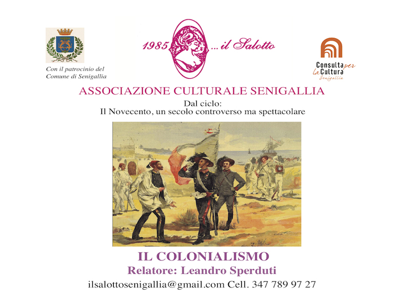 Chi è interessato deve andare su www.youtube.com e scrivere nella riga di ricerca “Il Salotto di Senigallia” . Li trovate le conferenze che abbiamo finora registrate con Sperduti sul novecento “L’attesa del novecento” e “Lo stile fantastico – dalla Secessione all’Art Nouveau al Liberty” già pubblicate in precedenza e dal 1 maggio “Il colonialismo”.