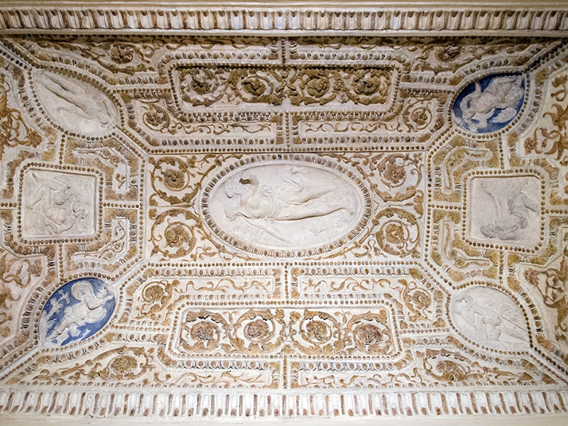 Si tratta dello splendido soffitto del “Camerino della vittoria” (1560/1565) fatto decorare dal plasticatore urbinate Federico Brandani da Giuseppe Baviera, colto umanista e letterato del XVI secolo. L’opera è sita nel Palazzetto Baviera di Senigallia e si distingue per grandiosità e bellezza, configurandosi come un viaggio ideale che percorre la storia dell’umanità: una mescolanza disinvolta di temi sacri e profani, tra umano e divino, secondo la visione dell’uomo rinascimentale, per il quale classicità e cristianità sono strettamente legati attraverso un complesso sistema di rimandi allegorici.