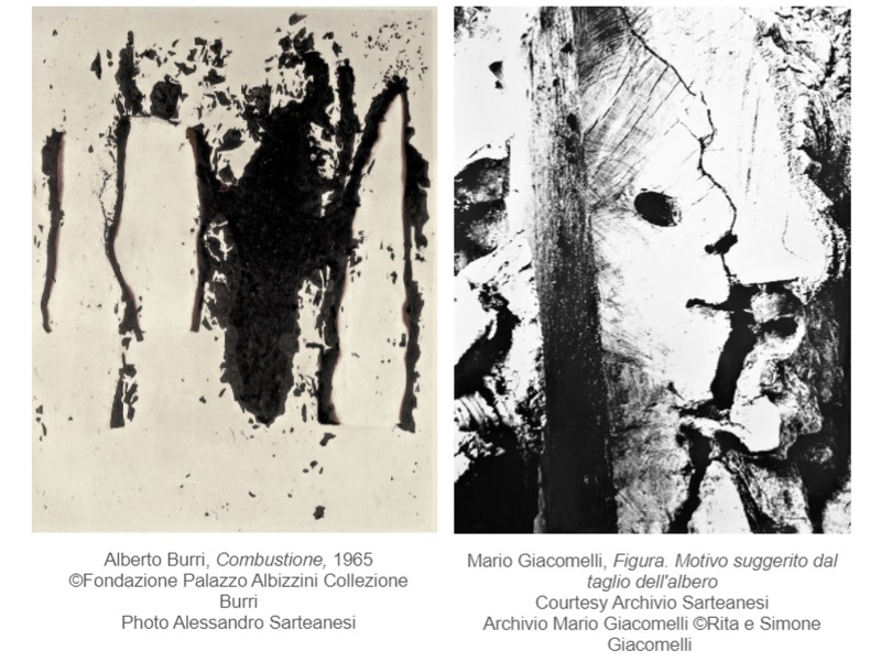 Nel percorso espositivo inoltre troverà spazio un’opera pittorica di Giacomelli che l’artista realizzò prima di consacrarsi interamente al mezzo fotografico. Le sue celebri fotografie di paesaggio saranno poi accostate ad alcune opere grafiche e uniche di Alberto Burri – come la serie Combustioni 1965, Cretti 1971, e ancora, Sacchi, Combustioni su carta e legno, un prezioso Cretto bianco – rintracciando affinità nell’organizzazione formale dello spazio dell’opera e rispetto ad una latente visione zenitale del paesaggio, restituito negli accostamenti delle diverse materie.