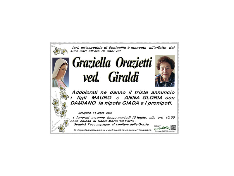 Ieri, all’ospedale di Senigallia è mancata all’affetto dei suoi cari all’età di anni 89 Graziella Orazietti ved. Giraldi.