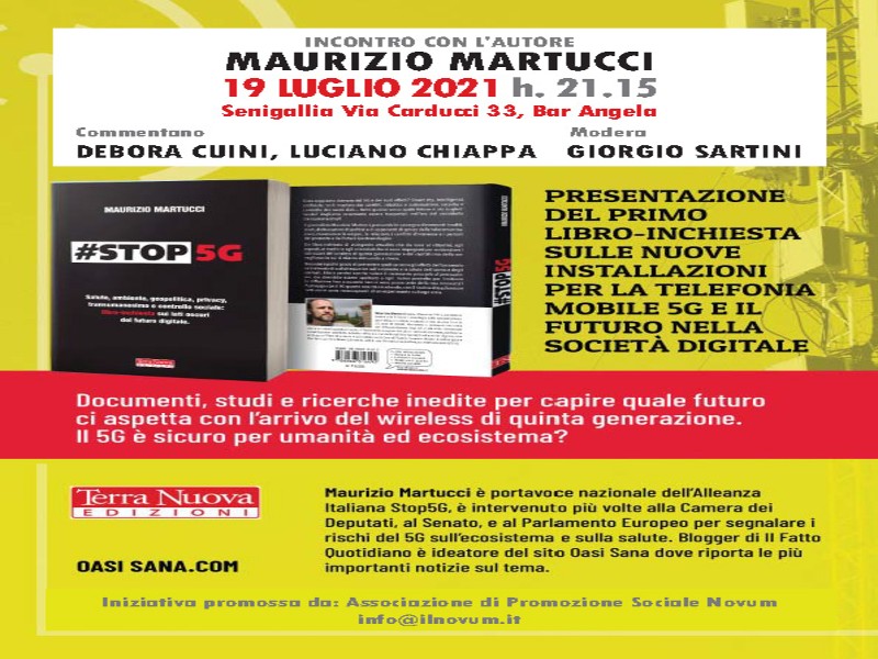 Lunedi 19 luglio 2021 a Senigallia, alle ore 21.15 in Via Carducci 33 presso il Bar Angela, incontro presentazione, con l’Autore Maurizio Martucci, del primo libro inchiesta sulle reti 5G e sul futuro della società digitale.