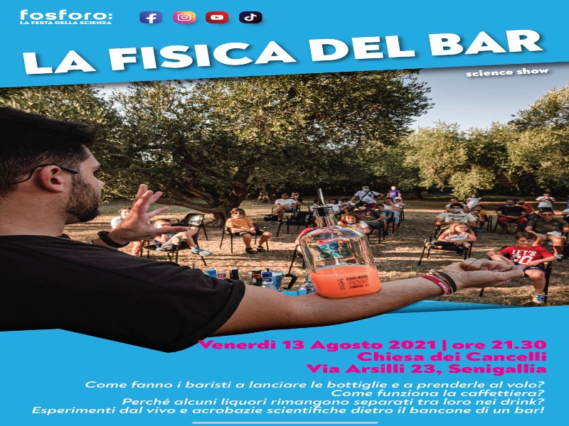 Grazie al contributo del Comune di Senigallia e in collaborazione con l’Associazione Albergatori torna l’animazione scientifica di Fosforo: la festa della scienza (www.fosforoscienza.it) che vedrà venerdì 13 sera andare il scena “La Fisica del Bar” e lunedì 16 “La Scienza del Volo”. Due appuntamenti con la formula della conferenza-spettacolo per approfondire temi scientifici legati alla vita di tutti i giorni.