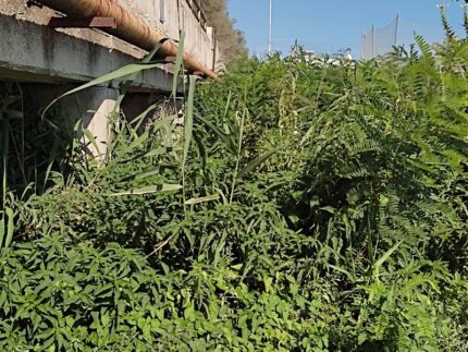 A destra e sinistra del ponte le sterpaglie hanno preso il sopravvento creando una fitta vegetazione, in gran parte secca, un autentico cerino in questa stagione accaldata in modo torrido. Fin qui…normale penserà qualcuno. La sorpresa però viene da “sotto” il ponte adibito a ricovero (sembra) della merce venduta in spiaggia (in modo legale?), forse pure alloggio, immaginiamo fresco anche se le condizioni igieniche non sarebbero delle migliori.