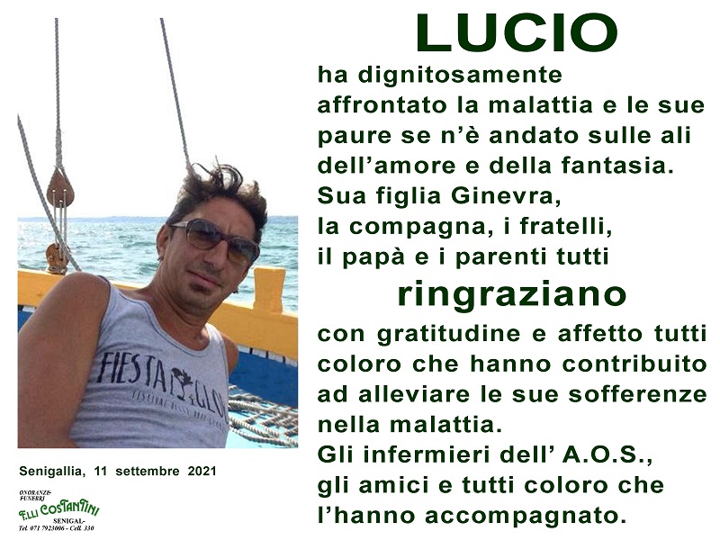 Lucio ha dignitosamente affrontato la malattia e le sue paure, se n’è andato sulle ali dell’amore e della fantasia. Sua figlia Ginevra, la compagna, i fratelli, il papà e i parenti tutti ringraziano con gratitudine e affetto tutti coloro che hanno contribuito ad alleviare le sue sofferenze nella malattia.