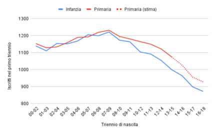 Il seguente grafico mostra l’andamento delle iscrizioni per triennio di nascita. In questo modo è possibile confrontare le iscrizioni della scuola dell’infanzia con quelle della scuola primaria.