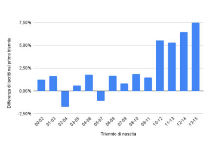 A tal proposito è interessante notare lo scarto tra le iscrizioni ai due gradi di istruzione: è aumentata la percentuale di bambini iscritti alla scuola dell’obbligo (primaria) ma non a quella dell’infanzia. Il fenomeno è evidente a partire dai nati nel triennio 2010-2012, come illustrato nel grafico seguente, che riporta la differenza in percentuale tra gli iscritti di primaria e infanzia.