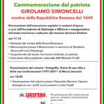 Il Centro Cooperativo Mazziniano “Pensiero e Azione” di Senigallia ha predisposto una complessa manifestazione, nel pomeriggio di sabato 2 ottobre, per ricordare il 169° anniversario della fucilazione di Girolamo Simoncelli, “martire laico” ed eroe della Repubblica romana del 1849, ucciso senza aver commesso alcun reato dal piombo papalino (2 ottobre 1852).