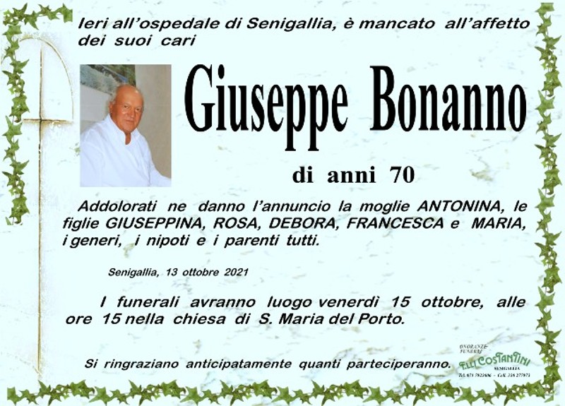 Ieri all’ospedale di Senigallia è mancato all’affetto dei suoi cari Giuseppe Bonanno, di anni 70.
