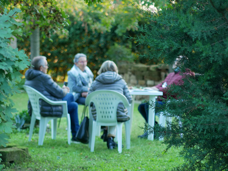 Nel pomeriggio, un tiepido sole ancora scalda l’incontro di “lettori” e “libri” intorno a un tavolo dove, adornato da composizioni naturali, “lettori” si apprestano ad ascoltare i “libri viventi”.