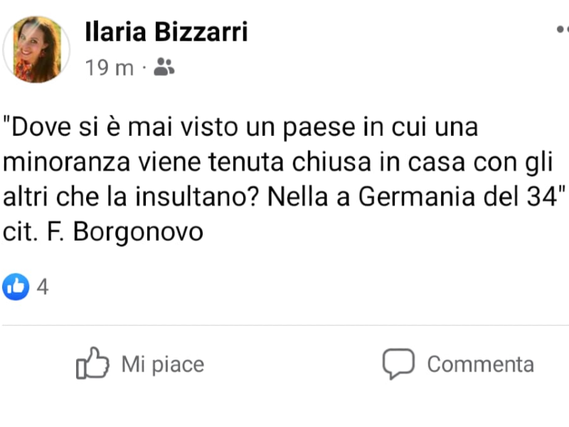A chiacchiere stiamo a zero, ed i primi ad essere ingannati da certe uscite sono proprio i no-vax, che da capro espiatorio diventano bacino elettorale cui strizzare l’occhiolino e … basta. Ecco più della non conoscenza della storia, ci preoccupa questo cianciare a vuoto che genera, come direbbe una battagliera mamma italiana: una politica divisiva. L’unica certezza è che questa destra si sta impegnando in tutti i modi a far peggio delle precedenti amministrazioni. Sarà difficile che vi riesca, e, di certo, deve ricordarsi sempre di essere loro riconoscenti che li hanno fatti arrivare al potere. Più che studiare la storia, l’assessora e tutti i suoi sodali, si preoccupino di ringraziare le precedenti amministrazioni.